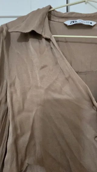 Camisa de mujer de la marca Zara en color beige. Confeccionada en un tejido satinado que le da un brillo sutil. - Diseño con botones. - Cuello camisero. - Manga larga.