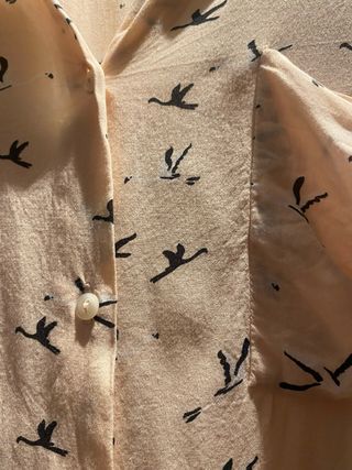Camisa con estampado de pájaros en color negro sobre un fondo rosa claro. - Diseño de pájaros volando. - Cierre de botones.