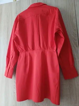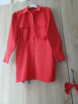 Vestido de la marca Zara en color rojo. Presenta un diseño de camisa con botones frontales y bolsillos en el pecho. - Cuello camisero. - Manga larga con puños. - Cintura elástica. - Cierre de botones.
