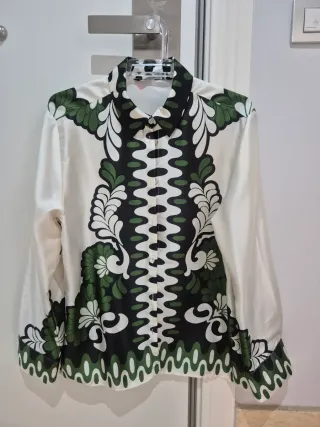 Camisa de Zara con un llamativo estampado de cebra en tonos verdes y negros. Perfecta para añadir un toque salvaje a tu look. - Diseño de manga larga. - Cierre de botones. - Cuello camisero. - Hombro caído Da talla