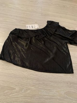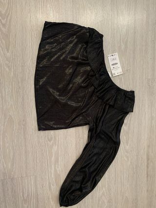 Elegante camisa de fiesta de Zara con un llamativo brillo. - Diseño de un solo hombro. - Volantes decorativos en el escote. - Manga larga abullonada.