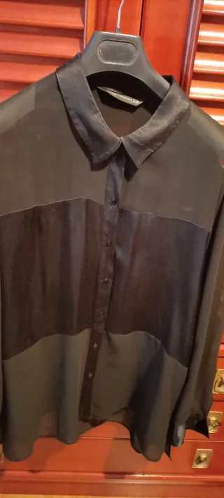 Elegante camisa de gasa y raso. - Diseño bicolor. - Cuello camisero. - Cierre de botones.media parte y manga semitransparente.casi nueva,2 puestas.ideal para estás fiestas.XXL.