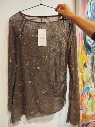 Camisa de la marca Zara con un diseño único y elegante. - Tejido de malla transparente. - Detalle de apliques en forma de lágrima. - Acabado con textura.