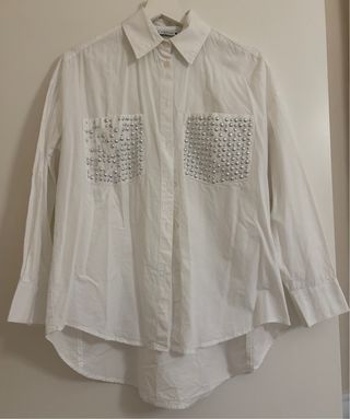 Camisa oversize de Zara con un diseño moderno y detalles únicos. - Bolsillos delanteros adornados con perlas. - Corte holgado y favorecedor. - Cuello clásico y cierre de botones.