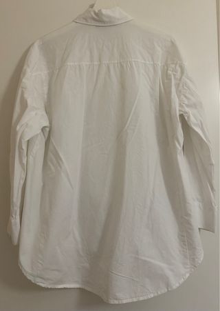 Camisa blanca de manga larga con un diseño moderno y corto. - Cuello camisero. - Bolsillo en el pecho. - Cierre de botones. En la penúltima foto, se puede observar, unas mariquitas negras que tiene, ese es el único desperfecto, por lo demás está como nueva.