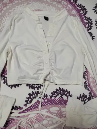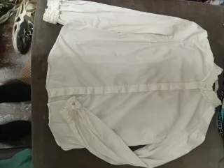Conjunto de dos camisas blancas, talla M. a 1€ las dos - Diseño con detalles de puntilla y entredós. - Mangas largas con puños. - Bajo con puntilla y pompones. Si miras mi perfil casi todo a 1€ o menos