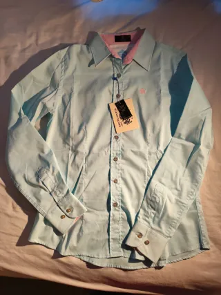 Camisa de manga larga color turquesa tejido elástico con detalles en rosa en cuello y puños. - Logo bordado en el pecho. - Cierre de botones. - Puños abotonados.
