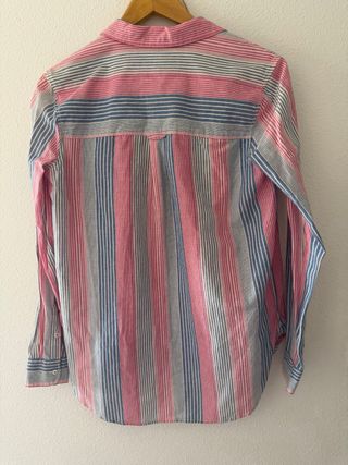 Camisa de manga larga con un diseño de rayas verticales en tonos rosas, azules y blancos. Presenta un bolsillo en el pecho y cierre de botones.