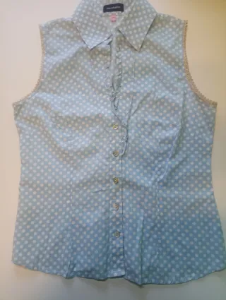 Camisa de mezclilla con un divertido estampado de lunares blancos sobre fondo azul. Es una prenda versátil con un estilo inspirado en la moda vaquera. Es tela finita, no vaquera pero lo simula. Muy buen estado. Sin defectos. Pone talla S pero más bien es una M o L - Manga larga. - Cuello camisero. - Cierre de botones. - Dos bolsillos en el pecho.