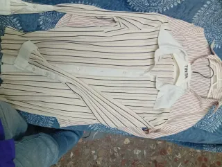 Lote de dos camisas de la marca TINTA con estampado de rayas. Son elásticas y cómodas. - Camisa de rayas finas en tonos beige y azul marino. - Camisa de rayas finas en tonos rosa y blanco.