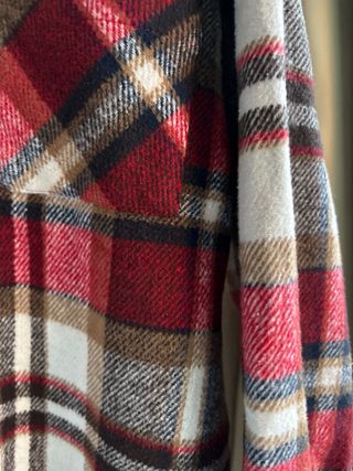 Camisa de manga larga con un diseño a cuadros en tonos beige, azul y marrón. Presenta detalles en ante o pana en la zona de los bolsillos y el cuello. - Cuello camisero. - Cierre de botones. - Dos bolsillos en el pecho con botón, que no cierran, sólo de adorno. Largo máx 75cm. Ancho entre axilas, 53cm.