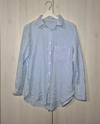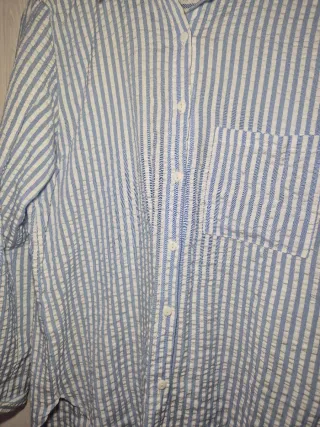 Camisa de manga larga con un diseño de rayas verticales en tonos azules y blancos. Presenta un bolsillo en el pecho y cierre de botones. - Diseño de rayas verticales. - Bolsillo en el pecho. - Cierre de botones. Hago envíos o entrego en Alicante, zona pla de la vallonga, no me desplazo