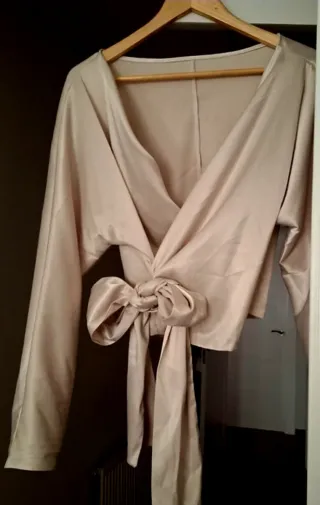 Elegante blusa cruzada en color champagne. -Su diseño con lazada le da un toque sofisticado. -Versátil,sirve también para usarla más informal con jeans. - Tejido satinado de mucha calidad. -Usada en una ocasión para una Comunión. -comprada en el Corte ingles.‼️ -Nueva - Manga larga. - Lazada ajustable en la cintura. -Es cortita,va a la cintura . -Envio rápido‼️