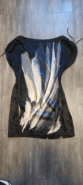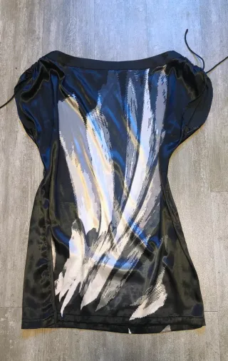 Elegante camisa italiana de talla M con un llamativo diseño. - Detalle de cadena dorada en el escote. - Acabado brillante en el bajo.