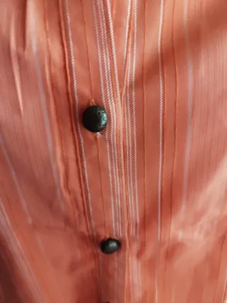Camisa de manga larga con un diseño de rayas verticales finas. - Cuello camisero. - Cierre de botones frontales. - Tejido con brillo sutil. Talla M, quizá se podría utilizar para alguna talla mayor, más ajustada. Las medidas son: - Axila a axila: 49 cm - Cintura: 44 cm - Cadera: 47 cm - Largo desde el hombro: 63 cm * No puedo trasladarme, sólo envío o recogida en mi domicilio* ** Descuento por lote **