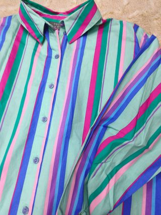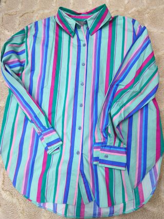 Camisa de manga larga con un llamativo estampado de rayas verticales en varios colores. El cuello es clásico y tiene botones en la parte delantera. Talla S, impecable, puesta en dos ocasiones.