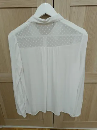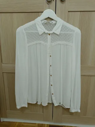 Camisa de Naf Naf en color blanco. Presenta un diseño con pequeños topos y detalles de encaje en la parte superior. - Manga larga. - Cierre de botones dorados Usada 2 veces