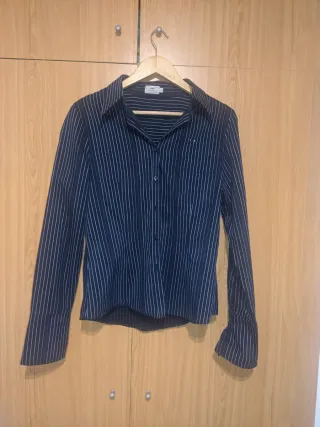 Camisa de manga larga con un diseño de rayas verticales en tonos azul y blanco. Presenta un cuello clásico y cierre de botones en la parte delantera. - Diseño de rayas verticales. - Cuello camisero. - Cierre de botones. Comprada en H&M