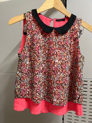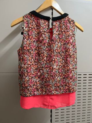 Blusa sin mangas en color coral con estampado y cuello negro. Tiene una mancha de tinta en la parte delantera como se ve en la foto.