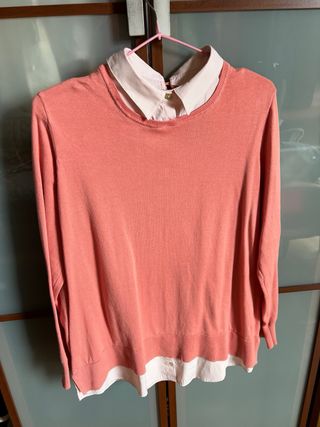 Jersey de punto fino color coral con cuello de camisa integrado. - Cuello de camisa a rayas. - Detalle de botón nacarado en el cuello.