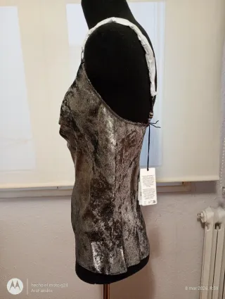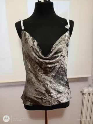 Top de la marca Guess con un diseño metalizado y drapeado. - Tirantes de cadena. - Acabado brillante.