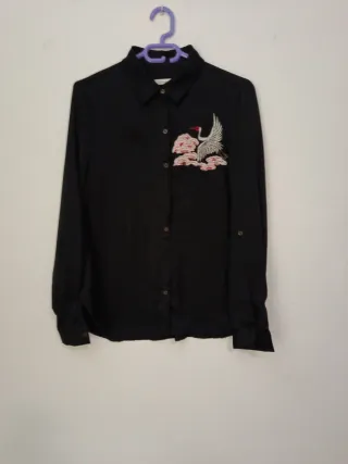Camisa negra crepe bordada grulla