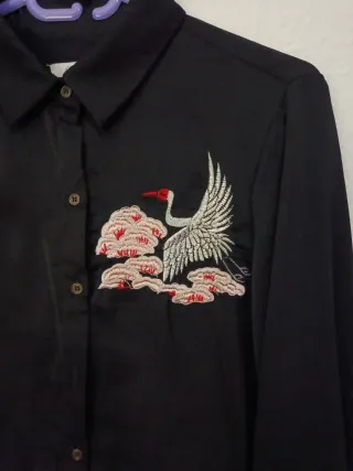 Elegante camisa de crepe con un bonito bordado de grulla y detalles florales. - Diseño de manga larga. - Cierre de botones. - Bordado frontal.