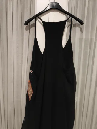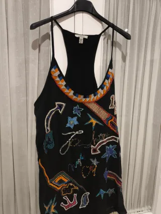 Camisa de tirantes negra, perfecta para el verano, con un diseño vibrante y detallado. - Bordados multicolores en el escote. - Adornos con lentejuelas y abalorios. - Estampados de estrellas y flechas. - Diseño tipo racerback en la espalda.