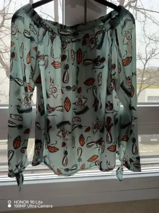 Camisa con un diseño llamativo y original. - Estampado con labios, ojos y otros elementos gráficos. - Mangas largas con puños anudados. - Diseño de hombros descubiertos.