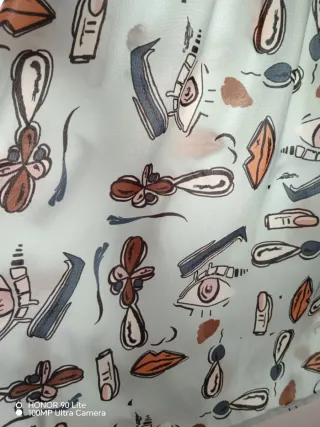 Camisa de Zara para mujer con un diseño de rayas finas y pequeños estampados de Gorgoritad. - Cuello camisero. - Cierre de botones. Ligeramente mas larga por la parte trasera.