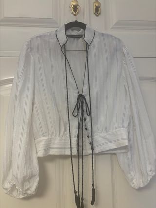Camisa blanca de Sfera con un diseño elegante y detalles únicos. - Tejido con textura y finas rayas verticales. - Cuello mao con ribete negro. - Cierre frontal con cordones y borlas. - Mangas largas abullonadas.