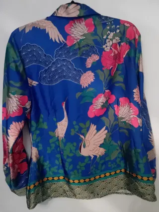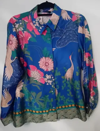 Elegante camisa con un vibrante estampado floral y de grullas. - Diseño con motivos orientales. - Cuello camisero clásico. - Cierre de botones frontales. - Bajo con detalle de cenefa decorativa.