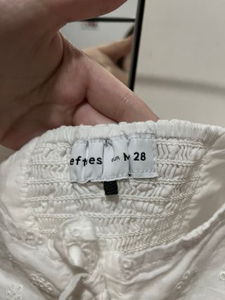 Camisa mujer blanca de algodón con volante en la parte de abajo. Manga 3/4, marca Naelle. Pone talla S, pero da más talla. Medidas: hombros 43 y de largo 62. En perfecto estado.