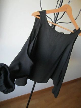 Blusa o cropped top de El Corte inglés en color negro. De manga larga terminada en puño elástico con goma y hombros al aire. Medidas: 53cm de sisa o pecho y 55 cm de largo total. Como para talla M oversize o L.