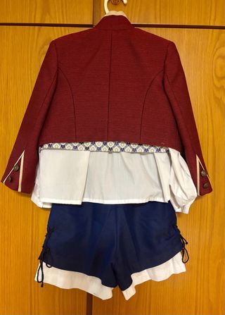 Conjunto de traje fallero para niño de la marca Lorca - Chaqueta granate. - Chaleco con estampado. - Camisa blanca. - Pantalón corto azul.