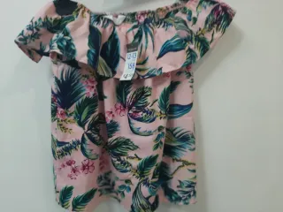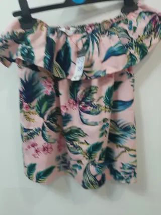 Camisa de niña con estampado floral tropical. - Diseño de hombros descubiertos. - Volante en el escote. - Mangas cortas. - Estampado de hojas y flores. 12/13 años