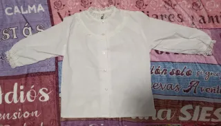 Camisa de estilo huertano para niña (talla 1). Presenta un diseño clásico con cuello adornado con encaje. - Cuello redondo con detalle de encaje. - Cierre frontal con botones. - Manga larga.
