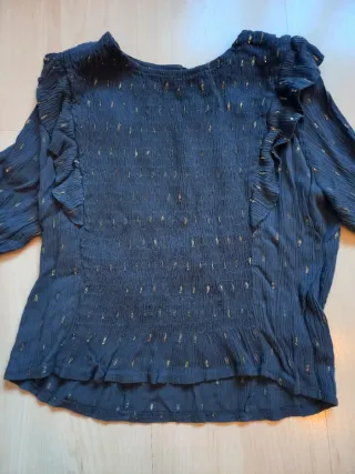 Camisa juvenil con un diseño moderno y detalles brillantes. - Mangas largas con volantes. - Cuerpo fruncido con detalles dorados. - Bajo con volante. - Queda muy bonita puesta - Es talla única pero bastante pequeña para niñas 11-12 años o adolescentes menuditas