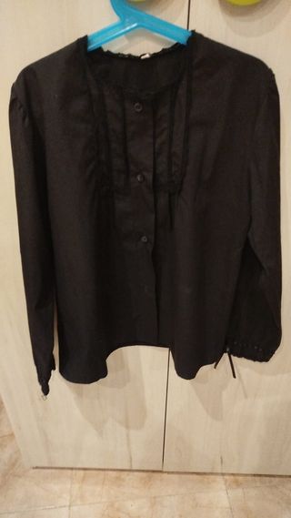 Camisa de baturra para niña. Color negro. Largo: 55 cms. Ancho de espalda: 45 cms. Largo de mangas: 50 cms. Detalle de puntilla pequeña en cuello y puños. Cierre con botones y lazo para ajustar en las mangas.