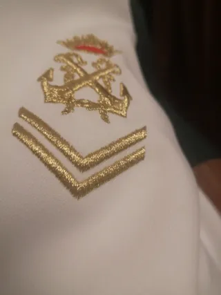 Traje de comunión para niño, modelo marinero. - Camisa blanca con cuello marinero azul y detalles de rayas. - Lazada de cuerda blanca. - Insignia bordada en la manga. - Puños y bajo con ribete azul.