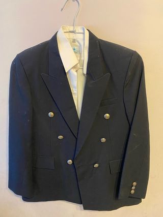 Traje de chaqueta para niño, ideal para eventos especiales como la primera comunión. - Talla 12 años. - Chaqueta cruzada con botones dorados. - Camisa blanca. - Pantalón a juego. - Salido de tintorería.