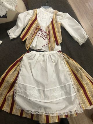 Conjunto tradicional de huertana para niña, talla 0 justillo y falda. Camisa talla 1. La falda tiene tela para sacar. Incluye blusa, chaleco y falda. - Blusa blanca con cuello y puños de encaje. - Chaleco bordado con detalles dorados y rojos. - Falda con estampado de rayas y delantal blanco bordado.