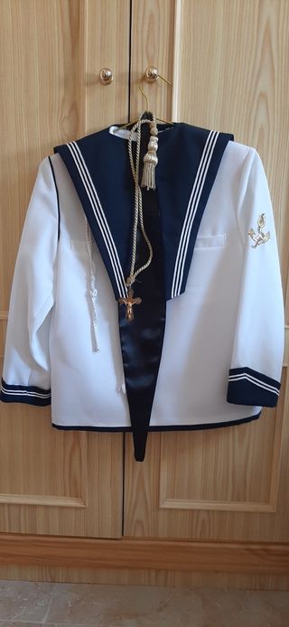 Traje de comunión clásico, usado una vez hace años. Perfecto estado aparte de haber cojido polvo en el cuello porque no lo tapó bien la funda. Viene con todo, camisa, pañuelo, cruz, y pantalón. Fue usado por un niño alto. El pantalón tiene elástico en la cintura y metido el dobladillo (se puede ajustar).