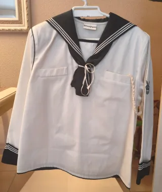 Traje de comunión para niño de El Corte Inglés. Marinero clásico. Talla 10. - Camisa blanca con cuello marinero. - Corbata azul marino con detalles blancos. - Puños y cuello con ribete azul marino. - Pantalón blanco con bolsillos, botón y trabillas para cinturón. - Cinturón incluido. - Una puesta. - Guardado siempre en funda. - Alguna mancha. Se recomienda llevar al tinte.
