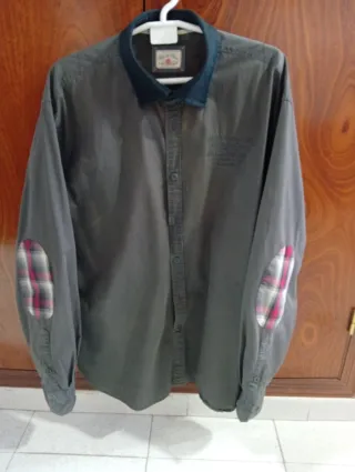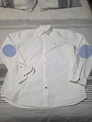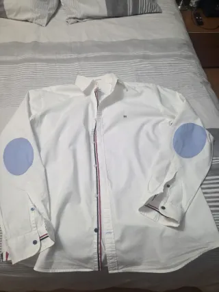 Camisa de Pedro del Hierro, una pieza de edición exclusiva. Talla 5-xl Preciosa camisa con coderas azules Puesta dos veces. Cinta con contraste en botonadura. - Diseño de manga larga. - Cuello clásico. - Parches en los codos. - Raya decorativa en la tapeta.