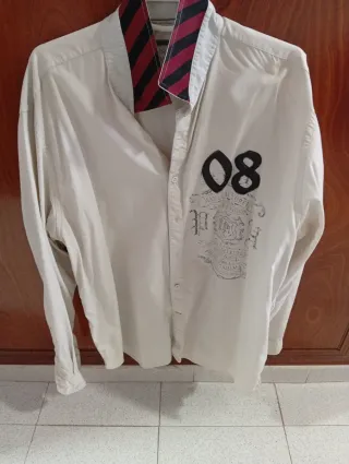 Camisa de manga larga de la marca Pedro del Hierro. - Color beige con detalles en cuello multicolor. - Diseño con estampado gráfico y número '08' en el pecho.