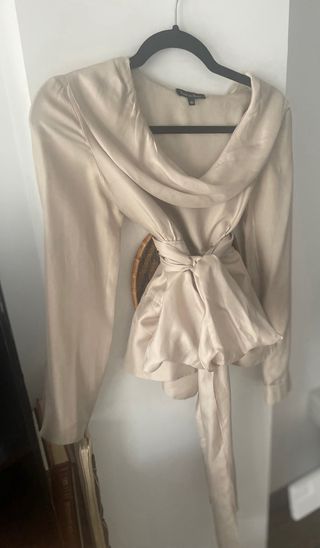 Elegante camisa de seda en color beige, con un diseño con cinturón para anudar. - Cremallera invisible lateral - Manga larga. - Cinturón a juego de la misma tela para ceñir la cintura