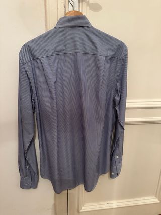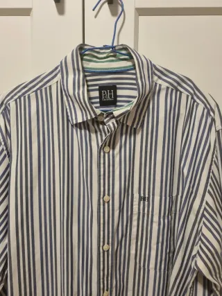 Camisa de Pedro del Hierro con un diseño de rayas clásico. - Diseño de rayas verticales azules y blancas. - Cuello camisero. - Cierre de botones. - Detalle en los codos. Medidas: Hombro 50 cm Sisa: 120 cm Largo 78 cm Manga 68 cm Cuello 45 cm