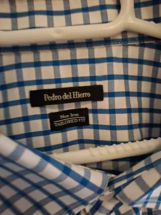 Camisa hombre Pedro del Hierro. 100% algodón. Talla 2 (ver medidas en fotografía 10). Cuadros blancos y celestes. Tejido muy agradable y confortable. Fácil planchado. En perfecto estado, usada poco (por cambio de talla). Ver fotografías de camisa completa, cuello, puños y axilas (fotos 4, 5 y 6). Entrega en mano en Sevilla (41008) o envío a través de Wallapop