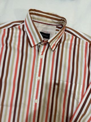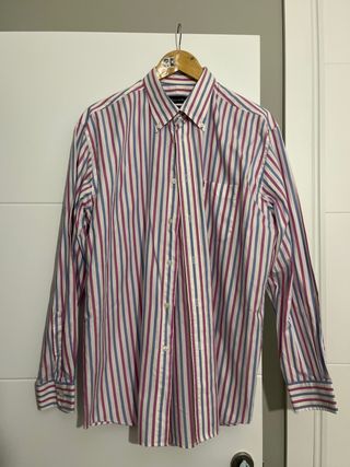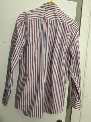 Camisa de vestir con un diseño de rayas verticales en tonos morado y blanco. NO HAGO ENVÍOS. RECOGER en la parada de metro ABRANTES de la línea 11 de Madrid. Esta como nueva, es un tejido muy bueno, se ha quedado pequeña pero está como nueva. Tiene una pequeña manchita. Tiene muchos detalles de calidad de la marca ✔️ - Diseño de rayas verticales. - Cuello camisero. - Botón frontal.